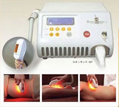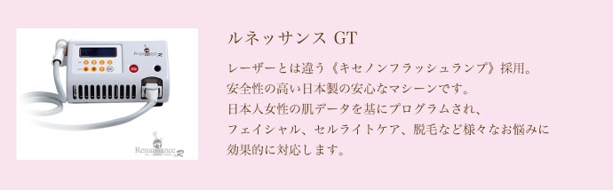 IPL[インテンスパルスライト]という光を使った脱毛です。可視光線から近赤外線領域の幅広い波長から脱毛に有効な光を抽出し、肌に熱を加え、毛を作る働きを弱めていくことで脱毛を行います。従来の脱毛器は毛乳頭および皮脂腺開口部という毛を作る部分を破壊する可能性が高く、やけどなどのリスクが多いですが、ルネッサンスーGTは毛乳頭おやび皮脂腺開口部を破壊する事のない安全な美容機器です。照射する光は成長期の毛にのみ有効で、退行期、休止期、の毛には反応しません。1か月半~2か月で退行期や休止期の毛が成長期に変わり、その時にまた脱毛を行うことで徐々に毛量を減らしていきます。ニードル脱毛やレーザー脱毛に比べ、いたみはかなり軽減されています。照射範囲が広く、施術時間も早く、負担なくトリートメントが行えます。