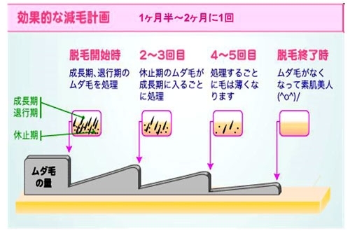 1ヶ月半~2ヶ月で退行期や休止期の毛が成長期に変わり、そのときにまた脱毛を行うことで徐々に毛量を減らしていきます。