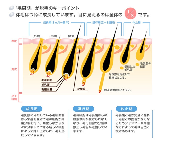 照射する光は成長期の毛にのみ有効で、退行期、休止期には反応しません。