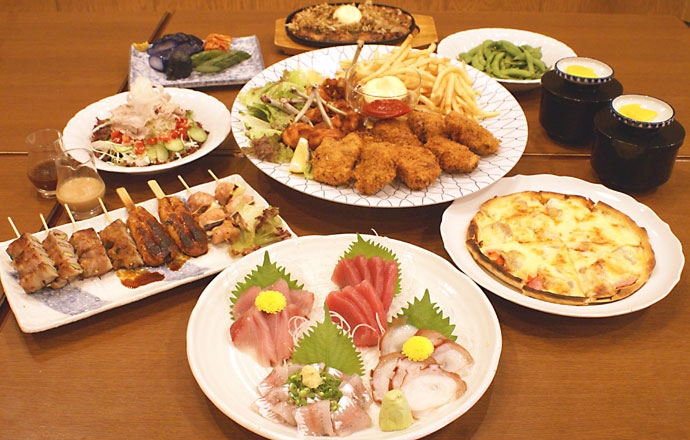 刺身の盛り合わせ(4点盛) オードブル(手羽揚・自家製メンチカツ・ポテトフライ) 季節のサラダ 枝豆 特製お好み焼 自家製ピザ 串焼き盛り合わせ(8本) 焼きおにぎり 香物 |