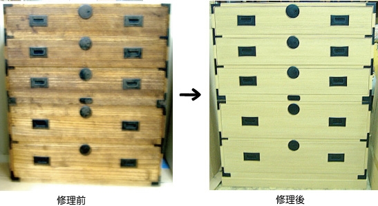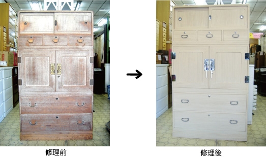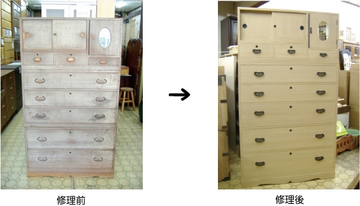 | 【修理例】 塗装も落ちて古びた和タンスも、まるで新品のように生まれ変われます。 |