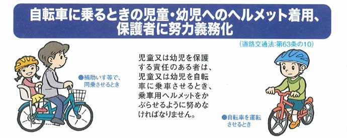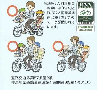 幼児2人同乗用自転車に限り、3人乗りで通行できます 3人乗りの要件・運転者は16歳以上であること・同乗させる2人の幼児は6歳未満であること・幼児2人同乗用自転車の専用座席に幼児を乗せていること※6歳未満の幼児1人を専用座席に乗せ、4歳未満の幼児1人をおんぶひもなどで背負って通行することも可能です。